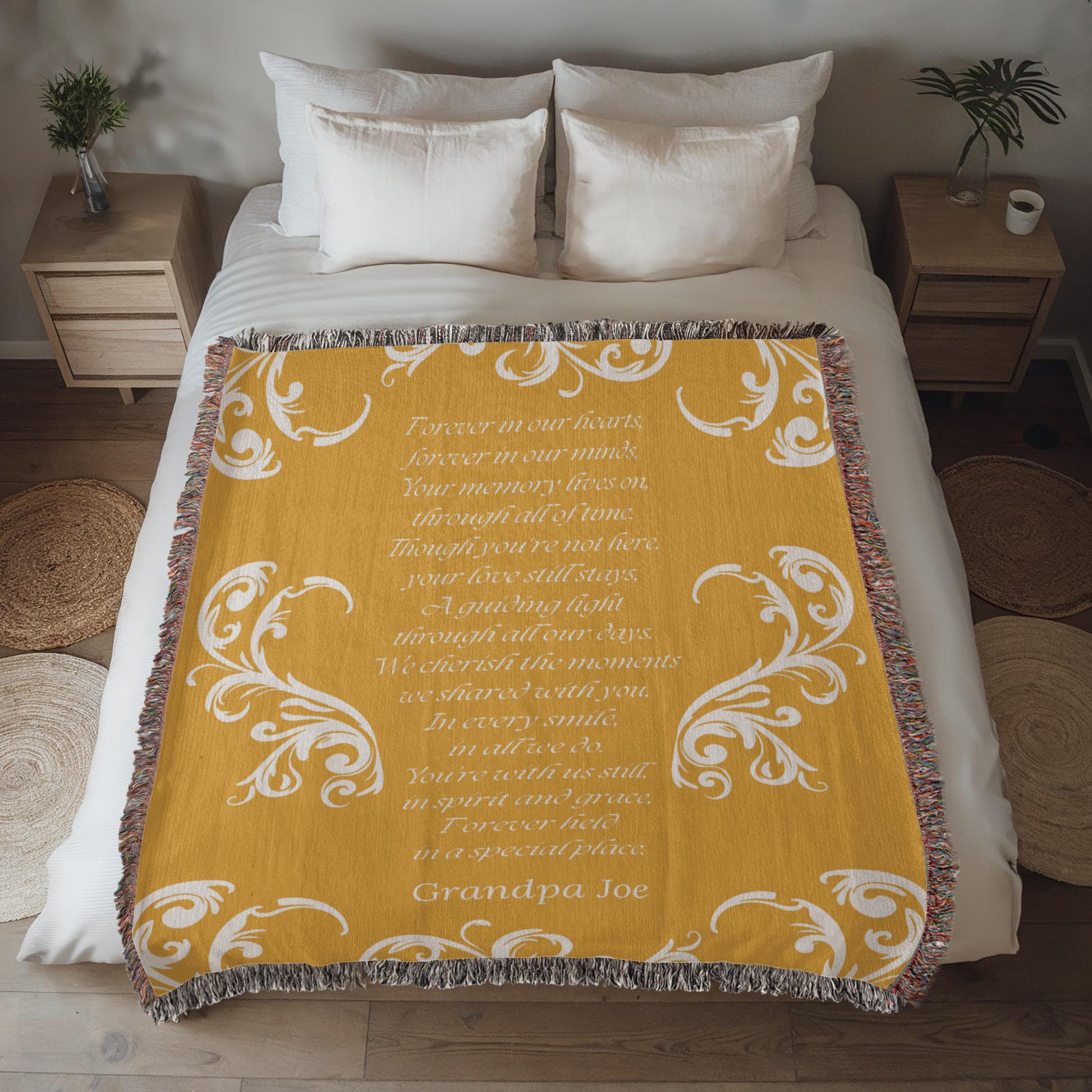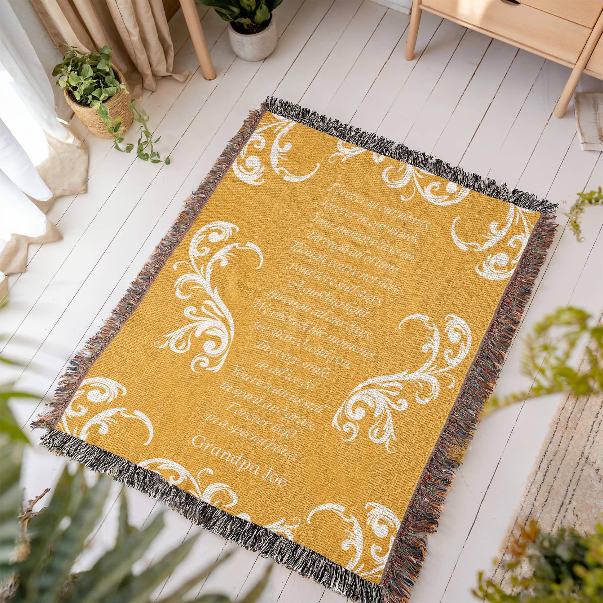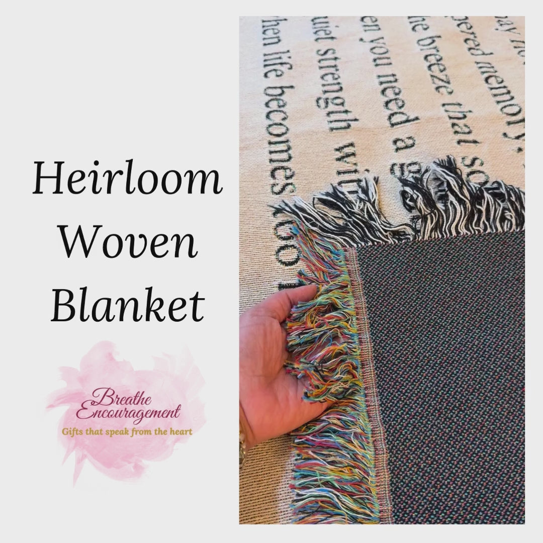 Wrap your memories in timeless beauty with our Heirloom Woven Blanket. Lovingly crafted to honor your loved one, this custom piece transforms your cherished memories into a woven masterpiece. A heartfelt way to celebrate a life well lived, bringing comfort and connection for years to come.