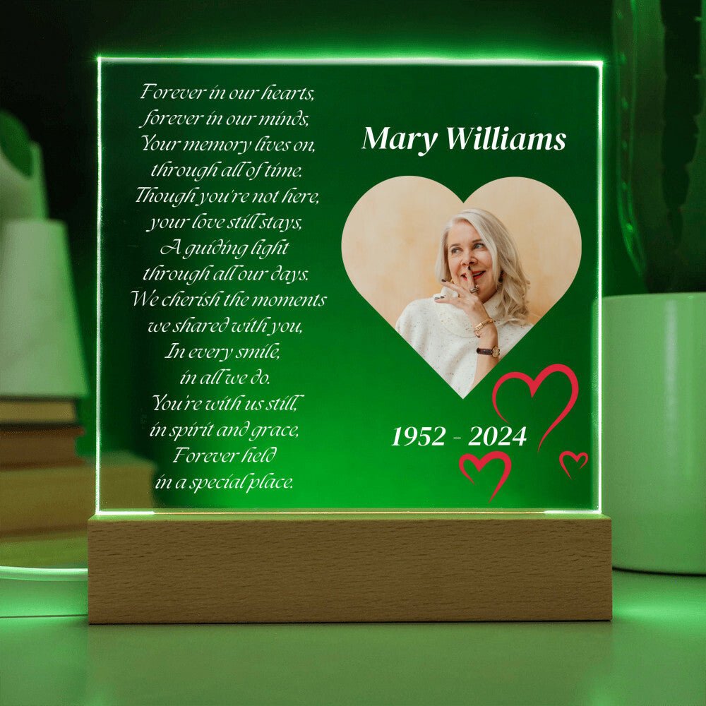 Forever in our hearts - Memorial Acrylic Square Plaque w/LED base