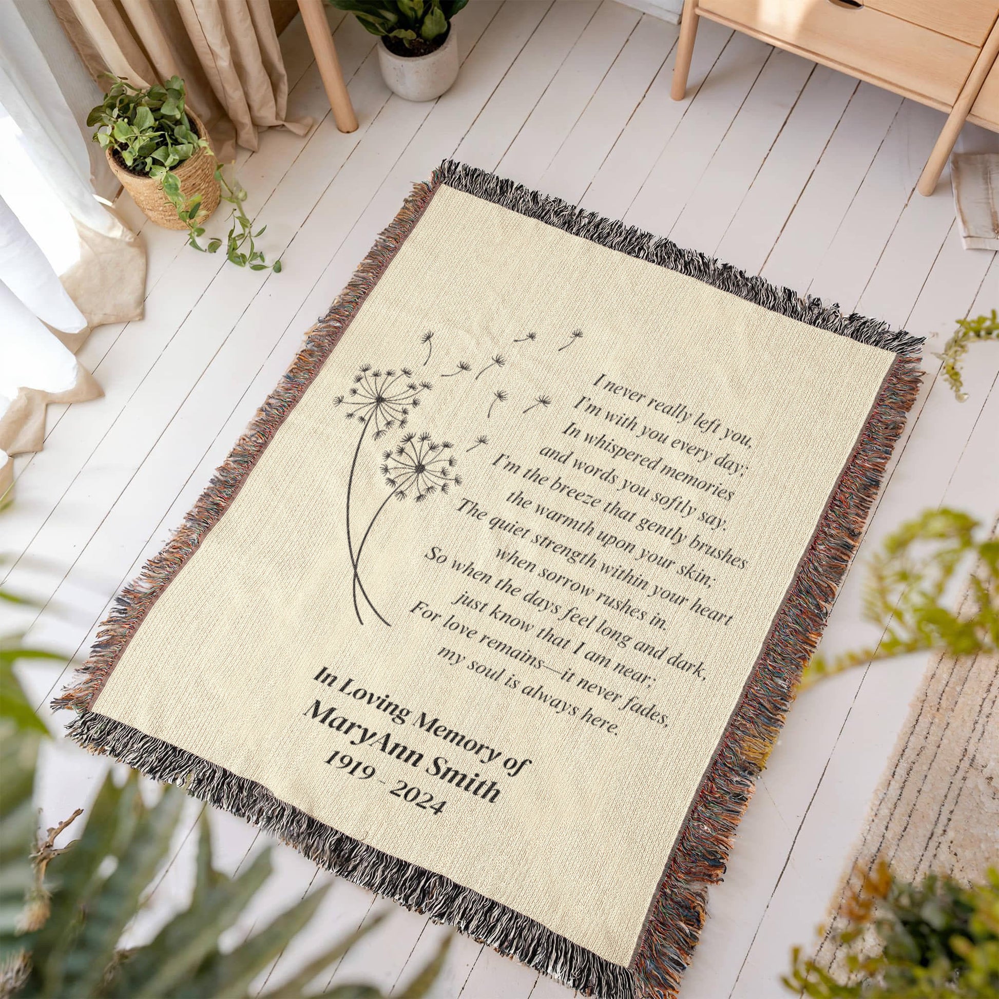 Wrap your memories in timeless beauty with our Heirloom Woven Blanket. Lovingly crafted to honor your loved one, this custom piece transforms your cherished memories into a woven masterpiece. A heartfelt way to celebrate a life well lived, bringing comfort and connection for years to come.