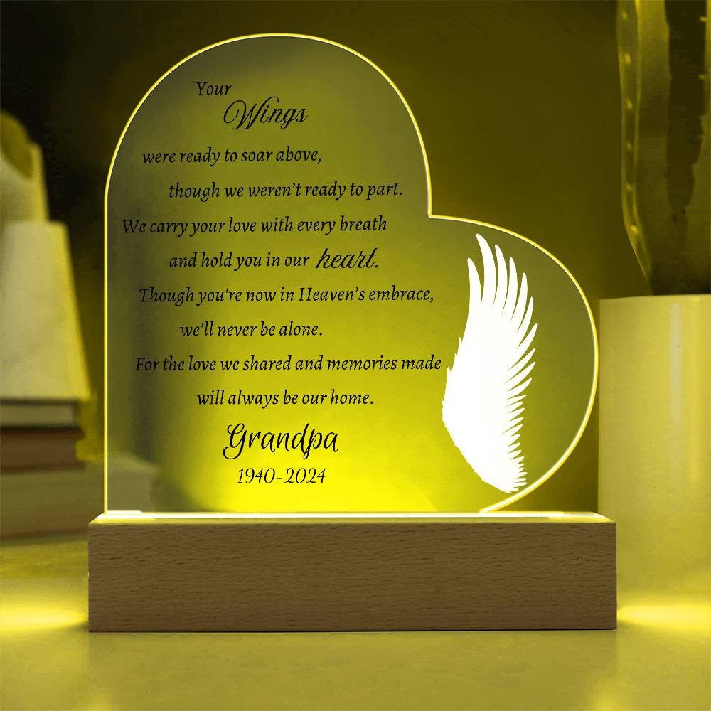 Your wings were ready to soar - Memorial Acrylic Heart Plaque w/LED base